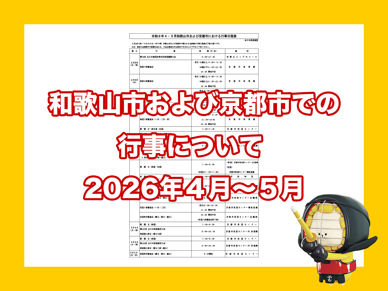 2026年4月29日(水・祝)〜5月6日(水・休)までの8日間、和歌山市および京都市で行われる全剣連諸行事の日程表をPDFでダウンロードできるようにいたしました。お役立てください。