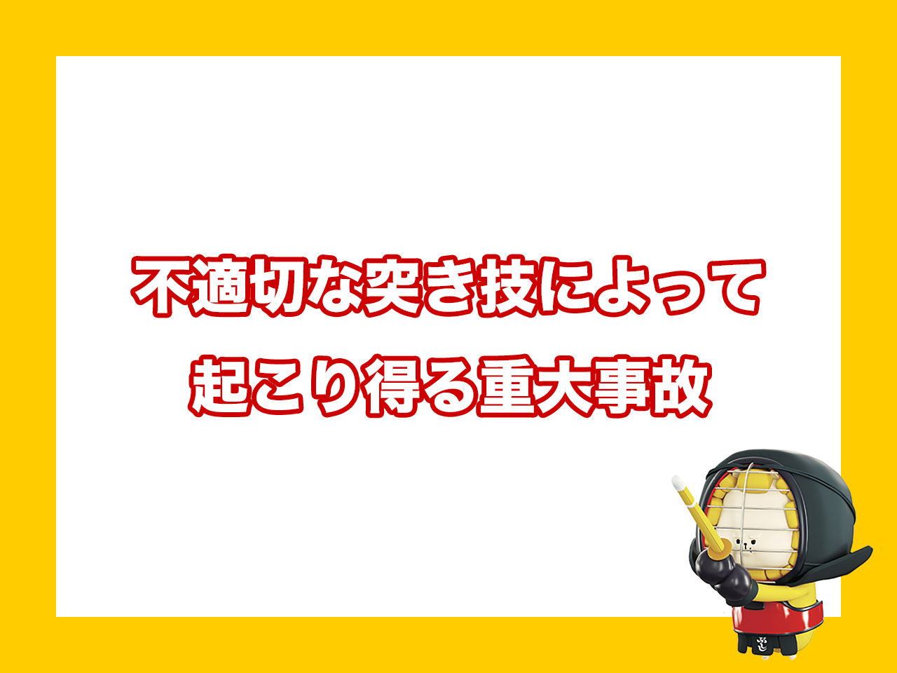 突き技は竹刀の先端を用いる技であるため、比較的小さな面積に力が集中します。このため面・小手・胴の打突よりも面積当たりのインパクトが非常に強くなり、その分防具から外れた時のけがのリスクが高くなります。 - 頭部が激しく揺さぶられ得ること