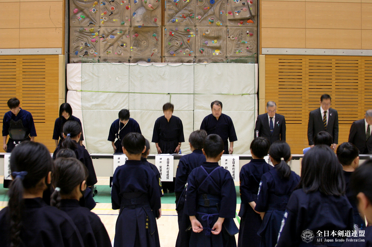 はじめに、竹刀や用具についての指導ポイントを話していただき、事故防止について指導がされました。その後、礼法、竹刀防具の持ち方、手拭いの使い方などの基本的な指導が丁寧にされました。最後に講師も混ざり地稽古を行ない講習会が終了となりました。