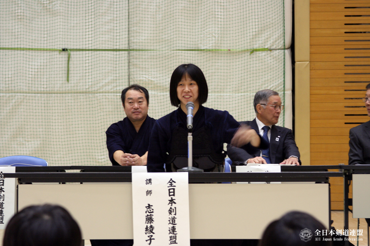 全日本選手権2度優勝の星子啓太選手と、全日本女子選手権9度の出場及び都道府県女子大会2度優勝を誇る志藤綾子選手より、剣道を始めたきっかけや幼少年時代の思い出、つらい経験を乗り越えたエピソード及び幼少年の皆さんへの激励の言葉が贈られました。熱心にメモを取ったり、言葉にうなずく小学生の姿が印象的でした。