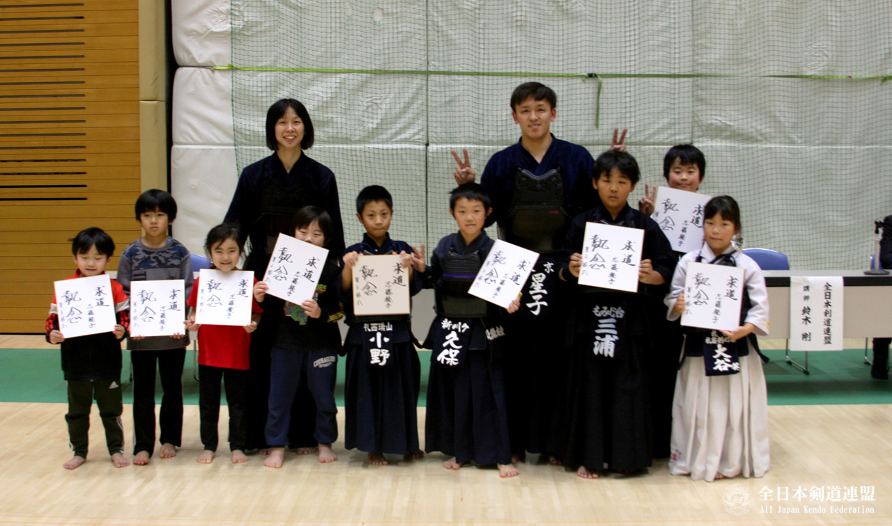 午前中の閉講式前に星子選手とじゃんけんし、勝ち残った幼少年に星子選手と志藤選手のサイン色紙が贈呈されました。その後閉講式が行われ午前中に幼少年剣士は解散しました。