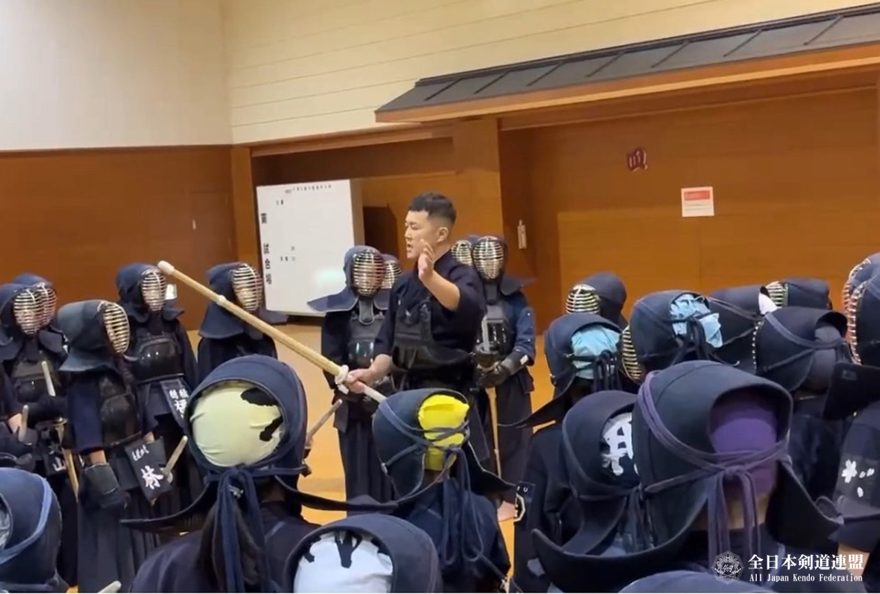 指導の中で、「大きな声を出すこと」といった気勢の重要性に加え、「振りかぶりの際に手首・肘・肩で五角形を作ること」「振った際には手首を伸ばすこと」といった、正しい姿勢と竹刀操作のポイントが具体的に伝えられた。